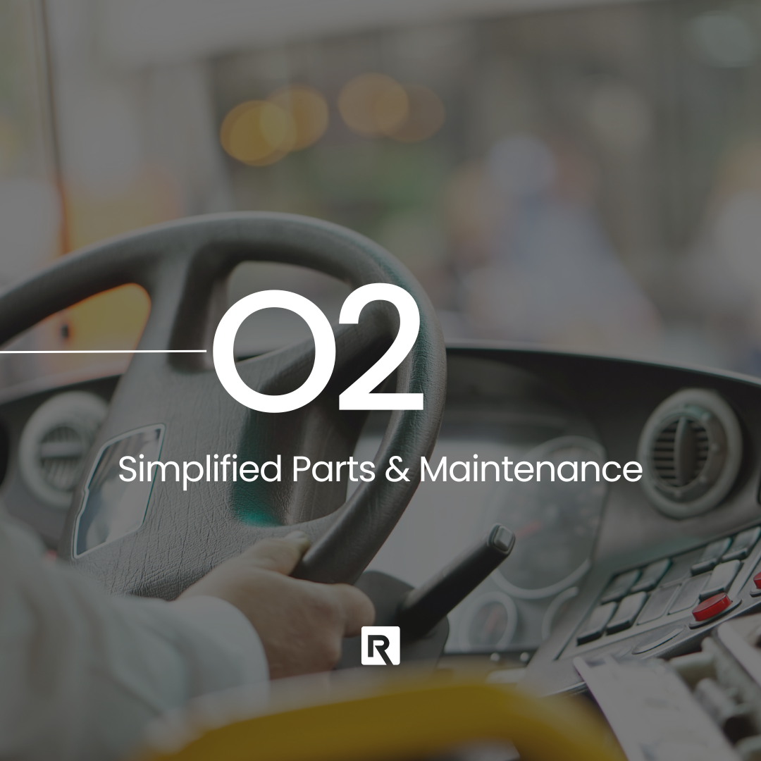 Symmetrical entry and exit doors simplify replacement parts service. Split windshield design, lower cost of replacement glass.